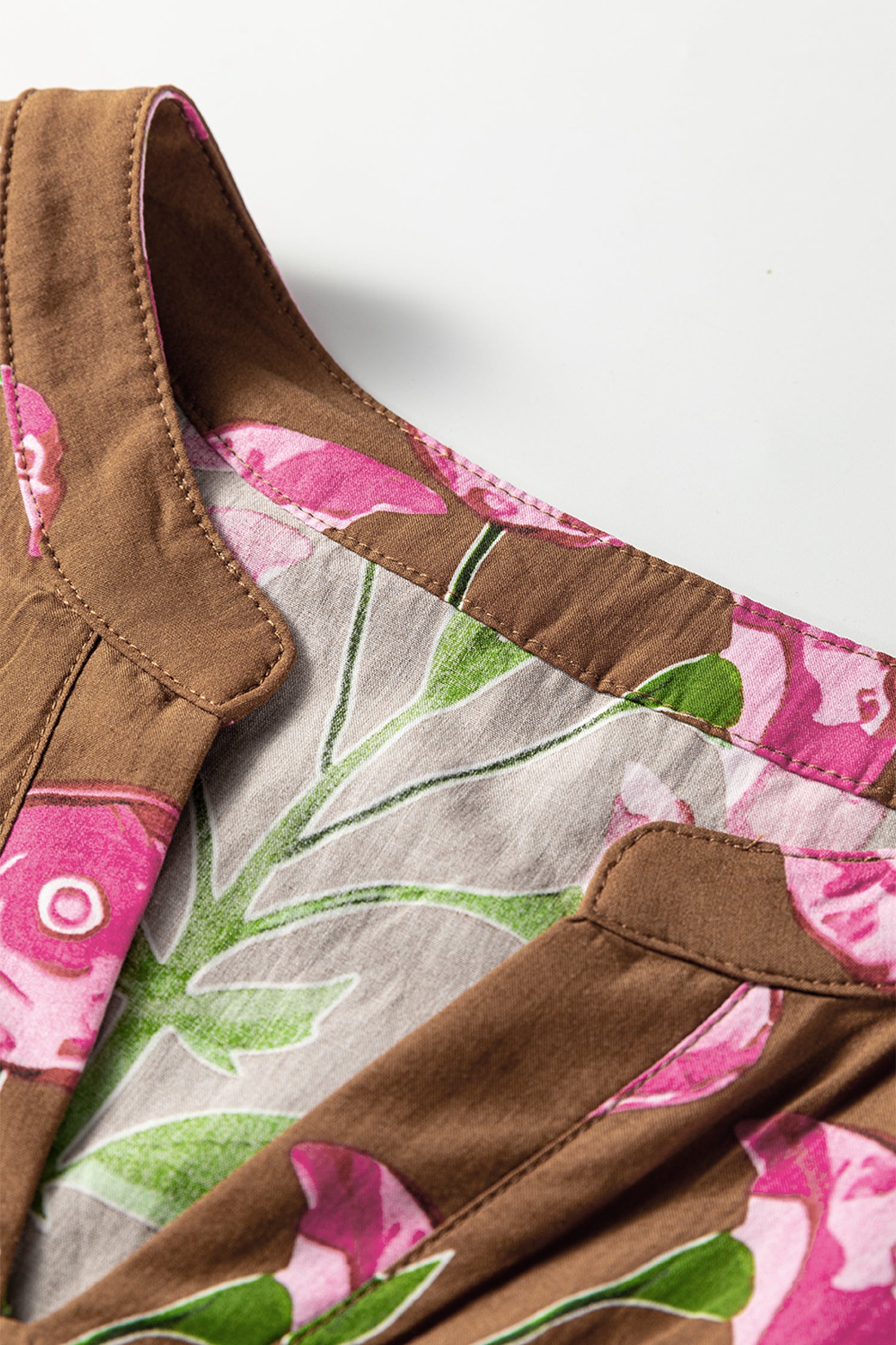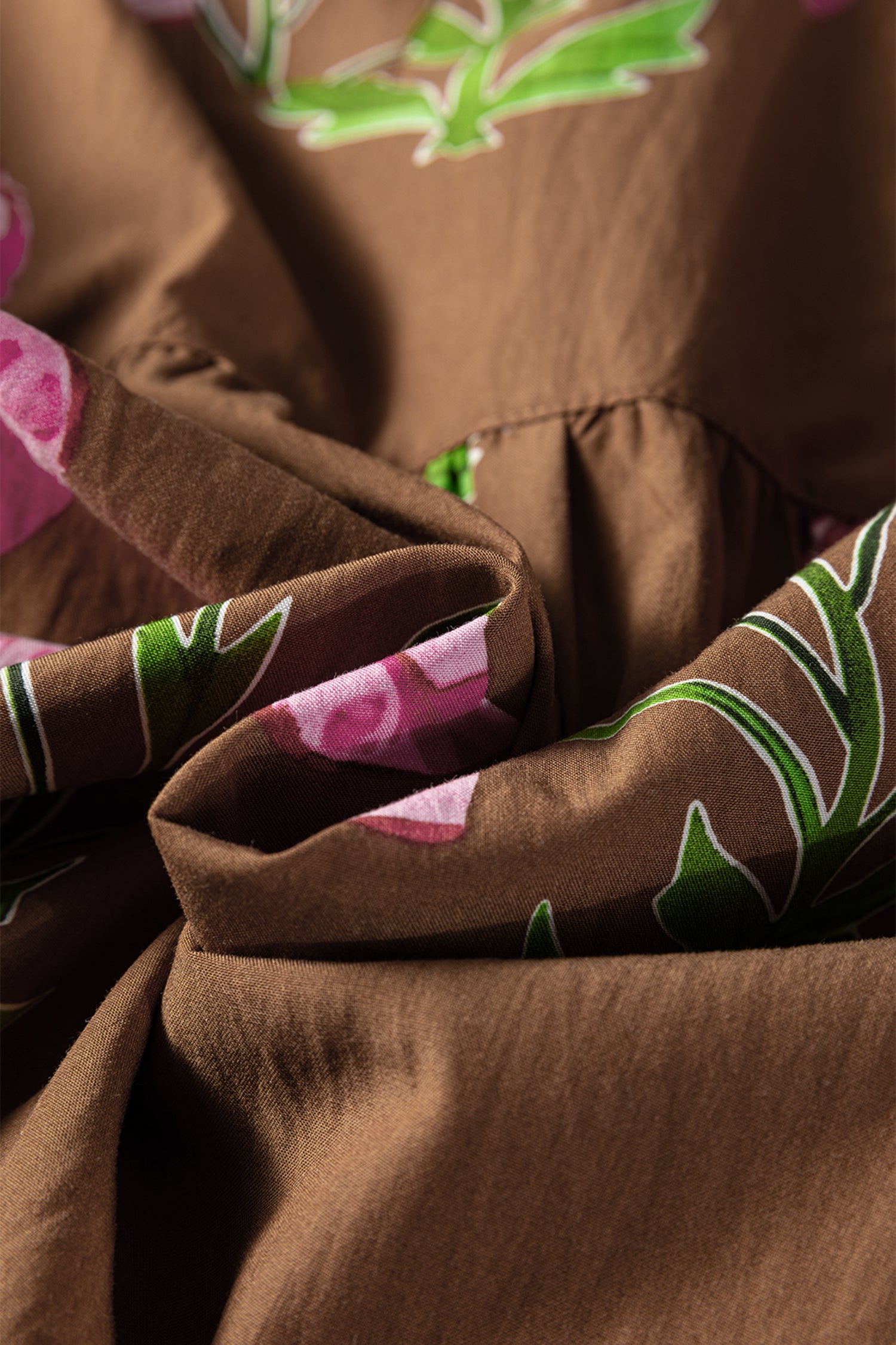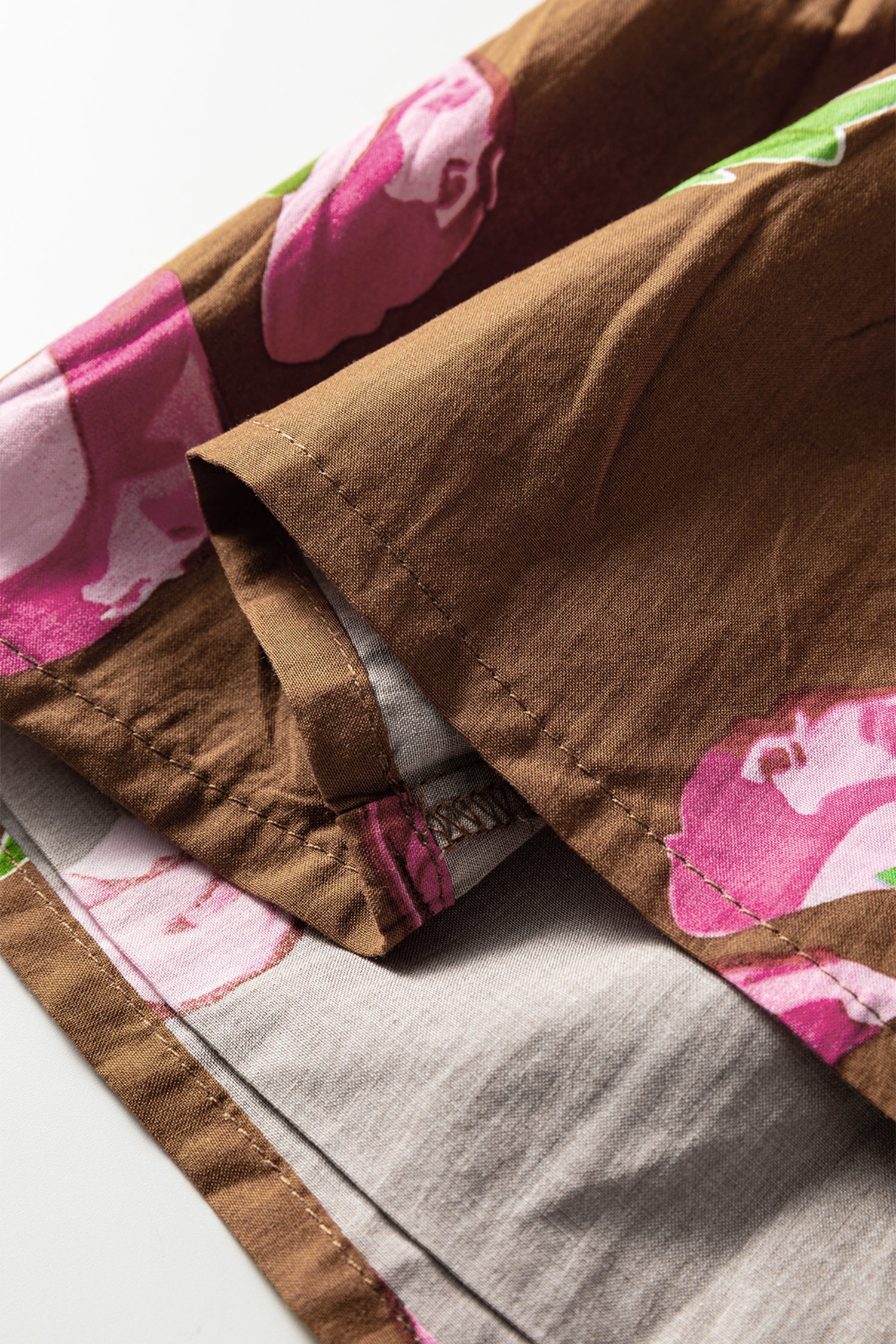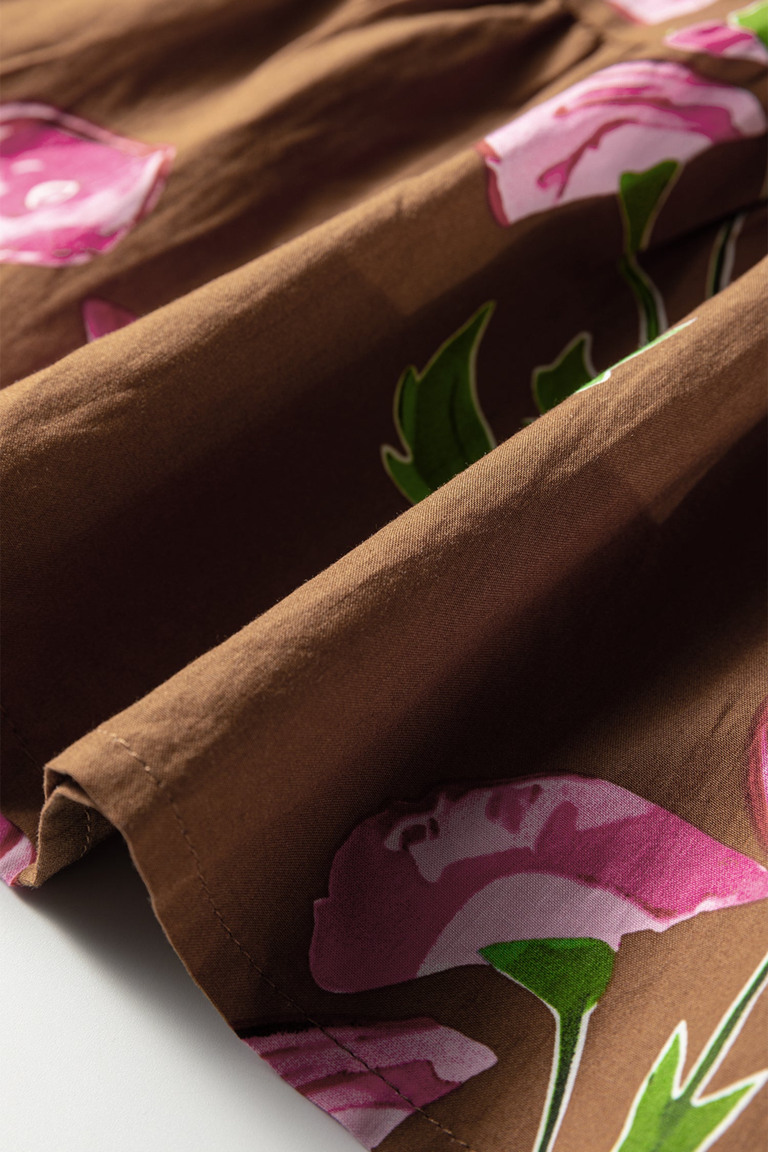 Brown Contrast Floral Print Babydoll Tunic Ruffled Hem Puff Sleeve Dress