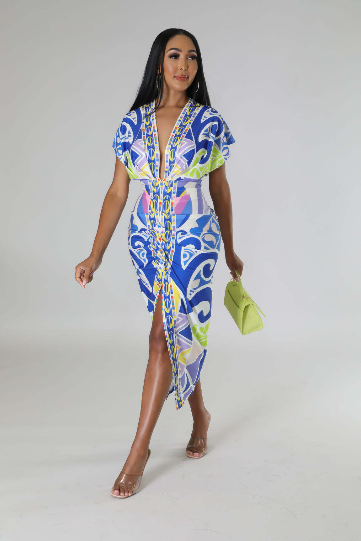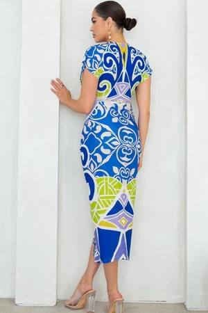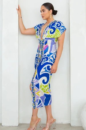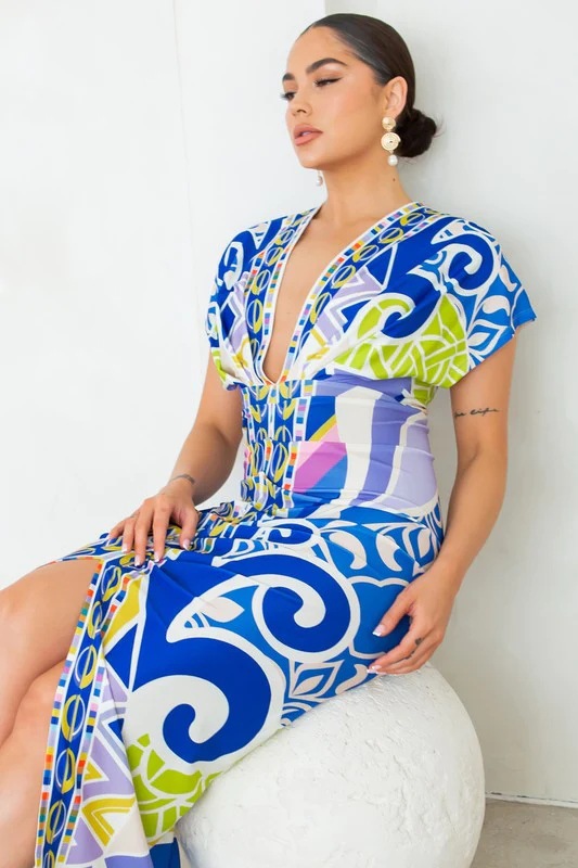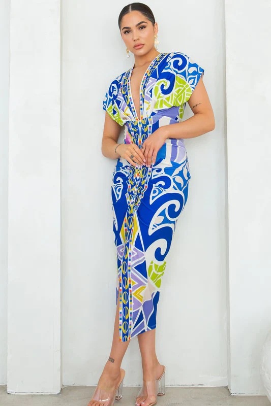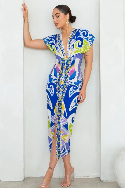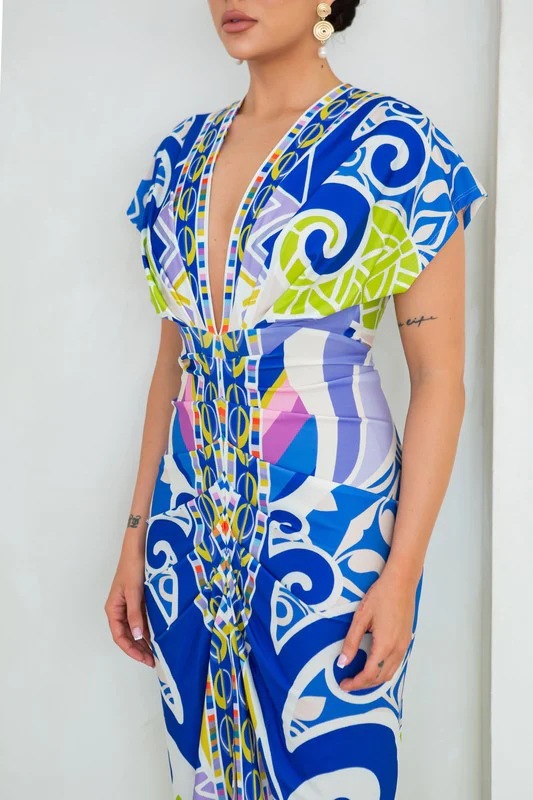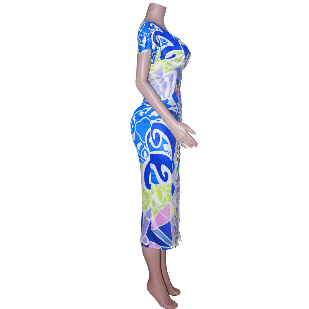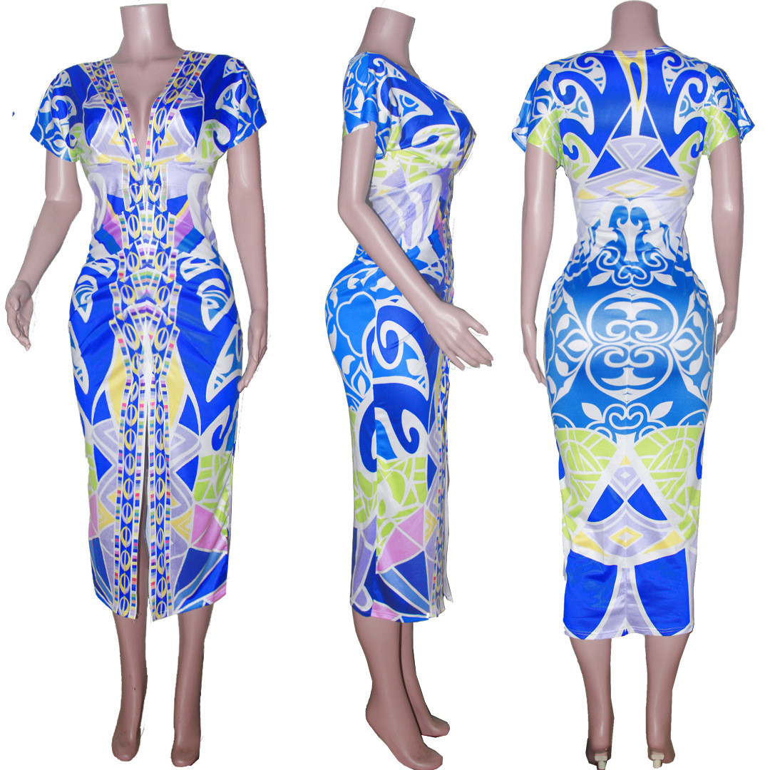 European and American New Printed Amazon Women's V-neck Tight Dress Ethnic Style Vent Positioning Pleated Dress