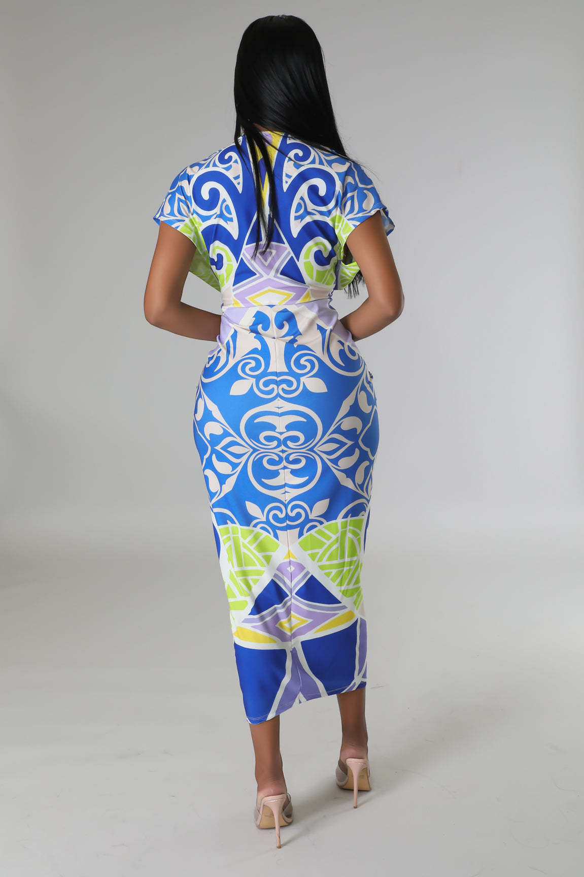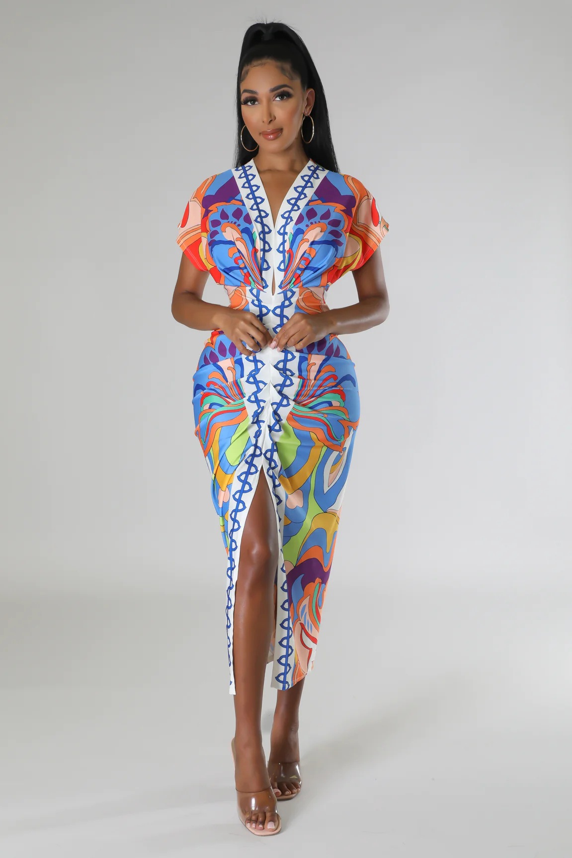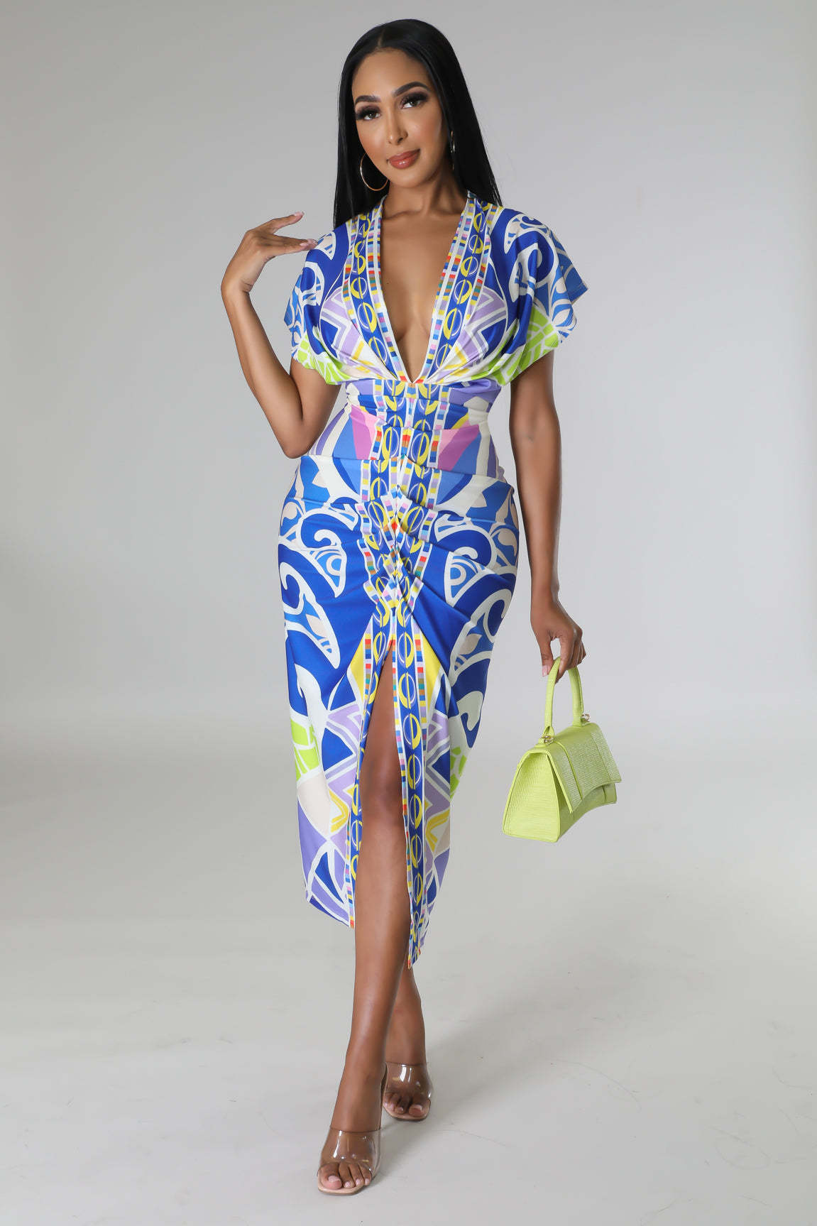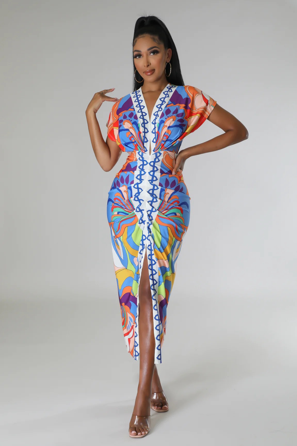 European and American New Printed Amazon Women's V-neck Tight Dress Ethnic Style Vent Positioning Pleated Dress