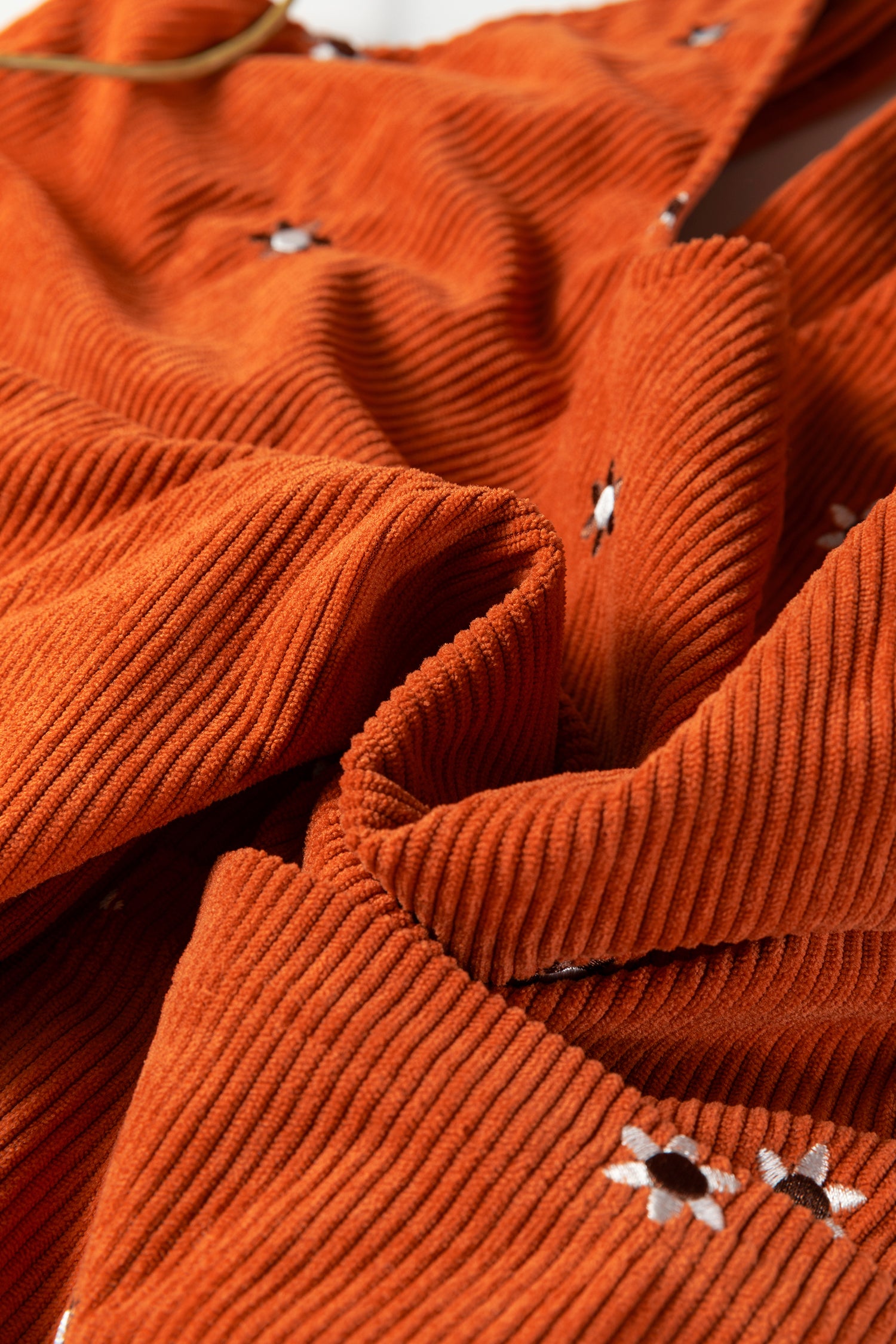 Gold Flame Flower Embroidered Corduroy Overall Mini Dress