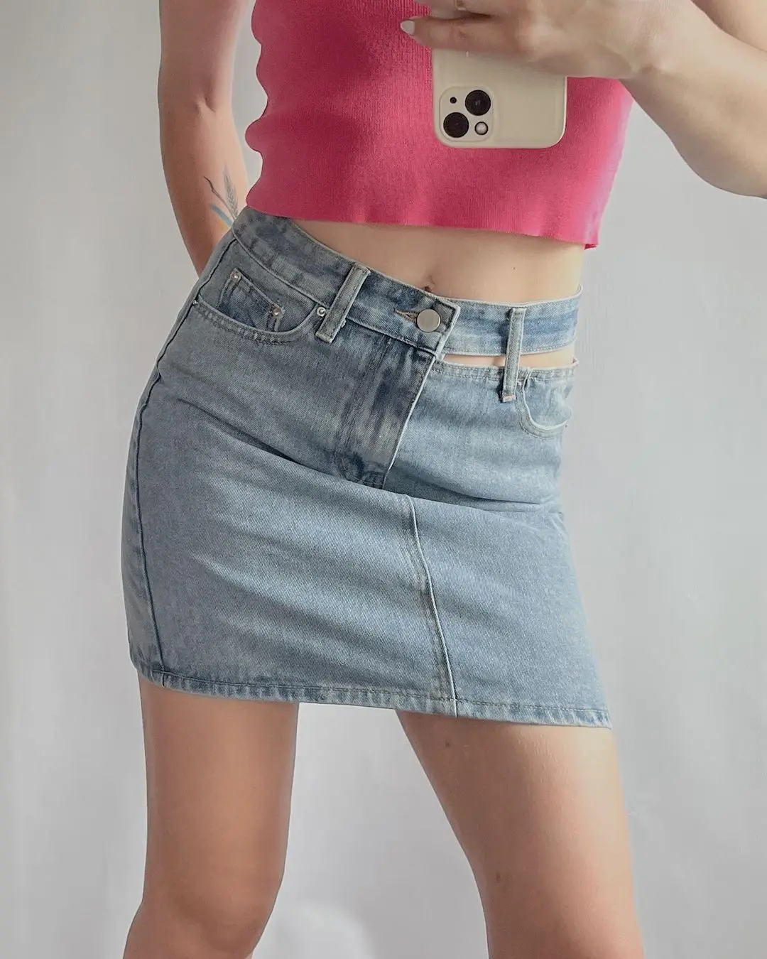 Kozoca Chic Single Side Hollowed Out Denim Skirt High Waist Slim Fit Casual Buttocks Wrapped Blue Short Skirts for Women