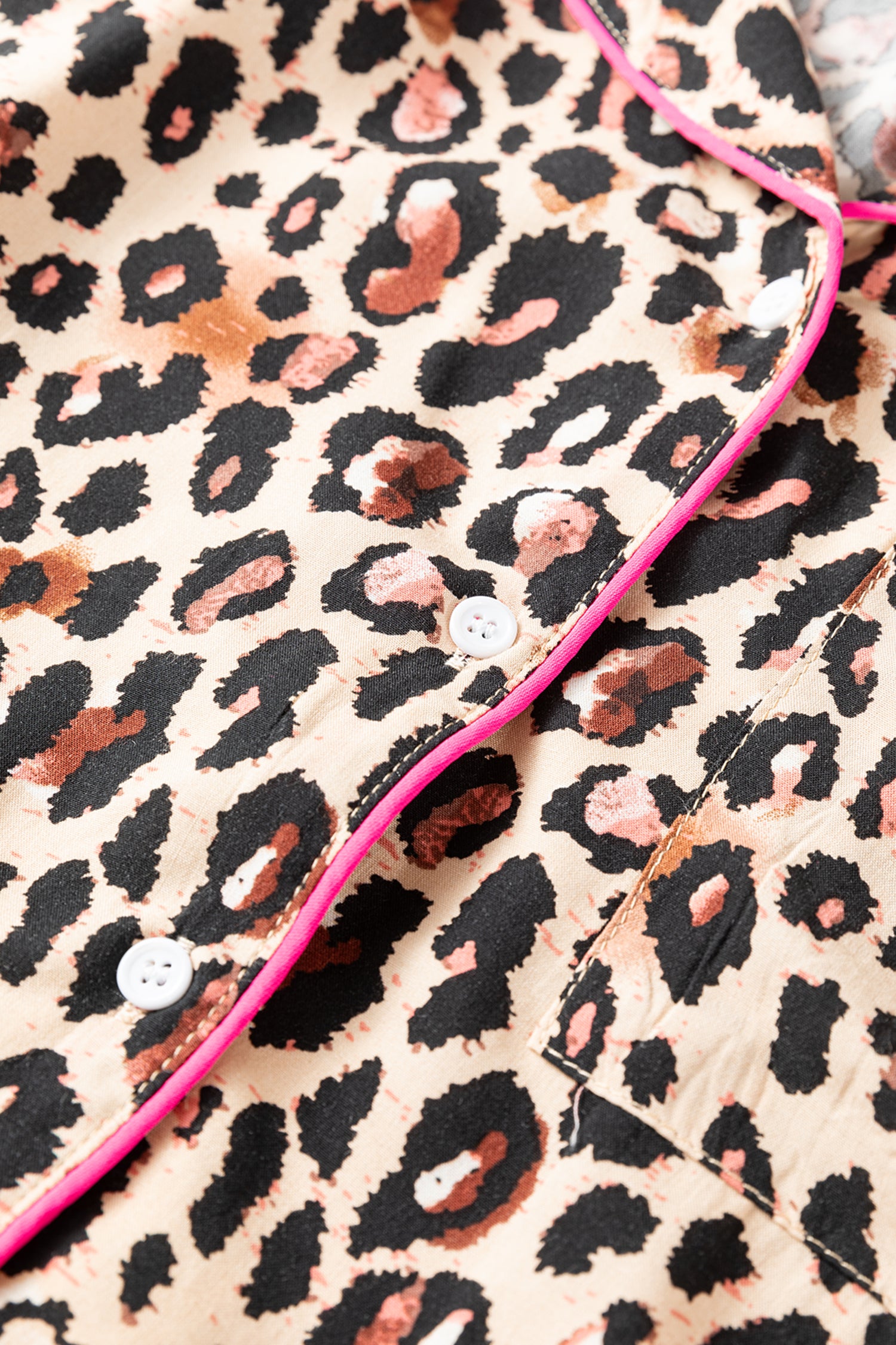 Light French Beige Leopard Print Contrast Trim Long Sleeve Shirt Drawstring Ruffle Hem Short Set