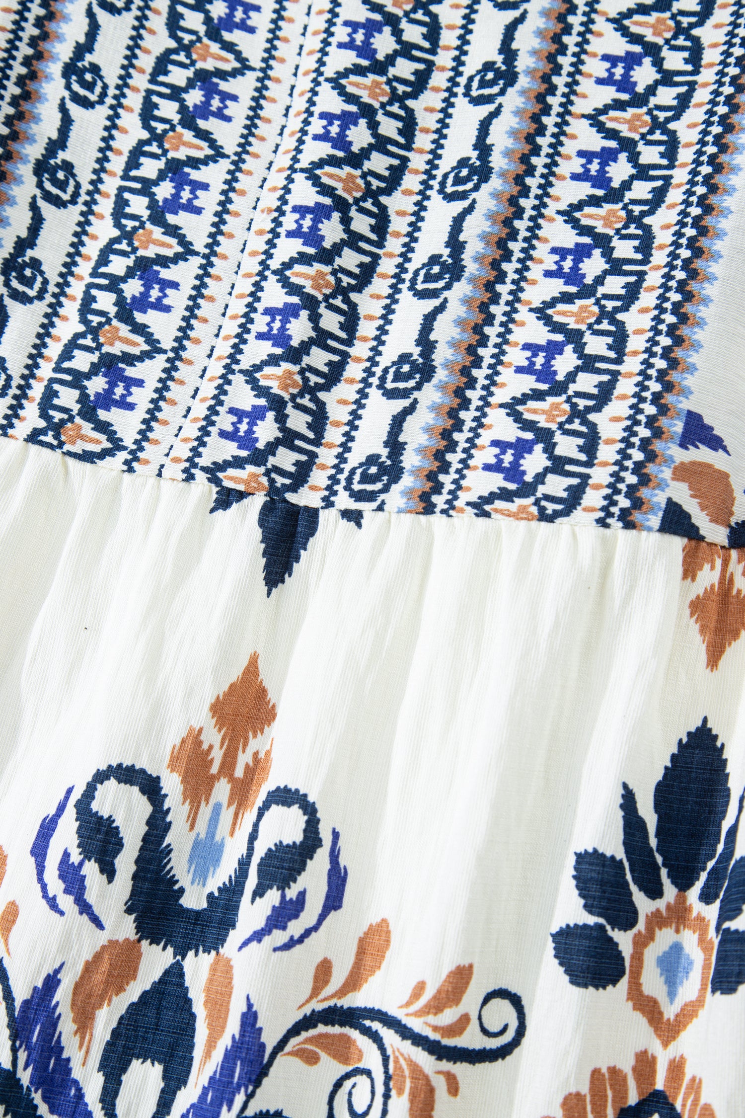 Sky Blue Plus Size Boho Print Split Neck Long Sleeve Mini Dress