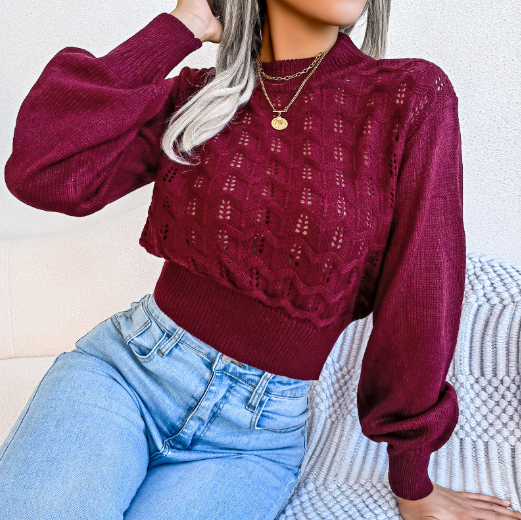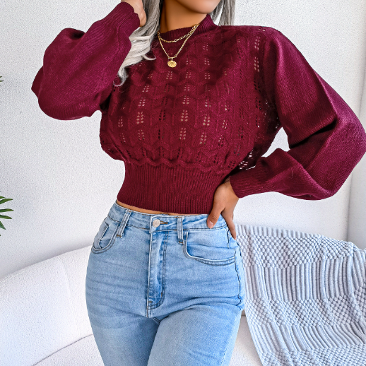 Solid color hollow striped lantern sleeve navel-baring knitted sweater